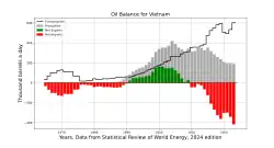 En 2023, le Vietnam a produit 0,188 Mb/j (millions de barils par jour)[i 4], soit 9,0 Mt (millions de tonnes) de pétrole, en baisse de 3,2 % en 2023 et de 47 % depuis 2013. Cette production représente 0,2 % de la production mondiale[i 5]. La consommation de pétrole s'est élevée à 0,602 Mb/j[i 6], soit 1,20 EJ, en progression de 12,2 % en 2023 et de 60 % de 2013 à 2023 ; la production nationale en couvre seulement 31 %[i 7].