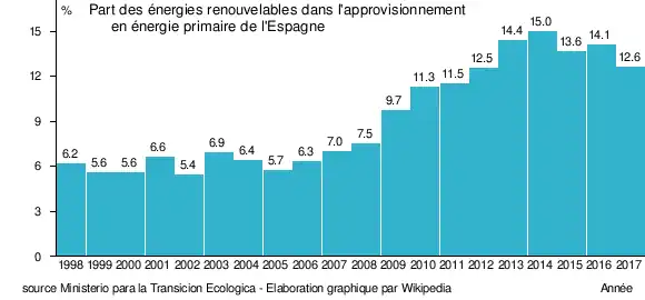 Ci-dessous est figurée l'évolution de la part des énergies renouvelables dans l'approvisionnement du pays en énergie primaire ; on y distingue aussi la dépendance de l'énergie hydroélectrique aux variations climatiques (années sèches ou pluvieuses) qui se voit clairement jusqu'au milieu de la décennie 2000 ; la baisse observée en 2011 provient d'une faible hydraulicité ; en 2012, les précipitations ont été encore plus faibles, mais la progression des autres EnR a compensé le déficit hydraulique ; en 2013 et 2014, la baisse de la consommation (-6,4 % puis -2,2 %) a fait croître la part des EnR ; en 2015, la sécheresse a fait chuter la production hydroélectrique de 27 %, les mauvaises conditions de vent ont réduit la production éolienne, et le redressement de la consommation a contribué à réduire la part des EnR ; en 2016, elle s'est légèrement redressée grâce à une hydraulicité en hausse de 30,6 % ; en 2017, la baisse de 48,4 % de la production hydroélectrique l'a fait chuter à nouveau[e 2]: