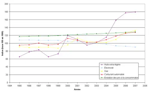En 2022, la consommation finale de produits pétroliers a été de 8,09 Mt (millions de tonnes), dont 5,97 Mt de carburants et 2,12 Mt de combustibles ; elle a peu varié jusqu'en 2010 (11 à 12 Mt/an), puis a baissé brutalement de 7,9 % en 2011 ; après une légère remontée en 2012-2013, elle a chuté à nouveau de 9 % en 2014 ; de 2019 à 2022, elle a encore reculé de 14,6 %. Le pic de consommation avait été atteint en 1992 avec 12,295 Mt[87]. Sur le total des produits consommés, l'huile extra-légère (fioul domestique) représente 25 % (en recul progressif, avec des fluctuations selon les températures : c'est elle qui est responsable des chutes de consommation de 2011 et 2014, dues à des hivers très doux ; sa consommation a baissé de 71 % par rapport à 1973) ; l'essence représente 25 %, le carburant diesel 32 % (en hausse constante jusqu'en 2019, sauf pendant la décennie 1990 : sa part était de 5,5 % en 1975), les carburants d'aviation 17 % (eux aussi en progression constante depuis 30 ans jusqu'en 2019, sauf dans les années 1990), le coke de pétrole 0,3 %, les autres produits pétroliers (gaz liquéfié, pétrole lampant, White Spirit) 0,8 %[88].