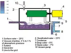 Le cycle commence par le pompage de l’eau de mer de surface qui se trouve dans les environs de 26 °C. On l’introduit dans un évaporateur qui sera mis sous vide, pour favoriser l’effet d’évaporation, car sous pression relative négative, l’évaporation se produit à plus faible température et la vapeur est débarrassée du sel, mais sur le débit d’eau qui traverse l’évaporateur, seulement 0,5 % de vapeur d’eau est produite, le reste de l’eau est rendu à la mer à 21 °C. La faible pression produite par la vapeur suffit à entraîner un turbogénérateur qui produira de l’électricité. Puis, la vapeur est transférée dans le condenseur à double paroi, qui avec l’eau froide pompée en profondeur vers les 5 °C, va faire condenser la vapeur en eau douce qui pourra être utilisée à la consommation.