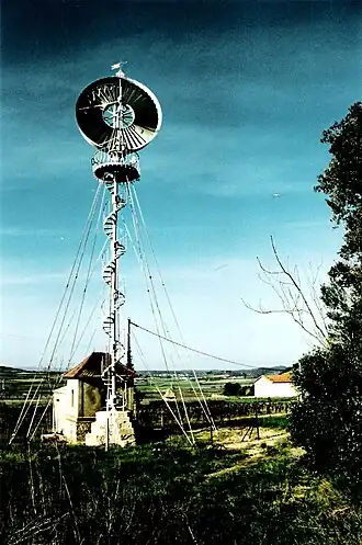 La turbine est constituée de deux rangs d'aubages de cinq mètres de diamètre, un stator et un rotor, équipés de pales courbes en tôle. Le stator, fixe, a pour fonction d'accélérer le flux d'air et de lui imprimer une pré-rotation afin d'alimenter les pales du rotor sous un angle plus favorable. L'énergie ainsi récupérée par le rotor est plus forte qu'avec un rotor seul. En outre, le flux est mieux canalisé et ressort du système dans l'axe au lieu d'être centrifugé et mis en rotation comme dans un moulin classique. Le fait remarquable est que ce dispositif, breveté en 1868, préfigure exactement un étage de turbine tel qu'utilisé dans les turboréacteurs, par exemple.