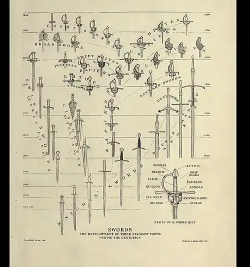 L'historien et illustrateur Ewart Oakeshott a réalisé une classification des épées médiévales en treize types principaux, en tenant compte principalement de la lame (forme, longueur, évolution de la section), mais aussi de la garde, du pommeau et de la fusée de l'arme.
