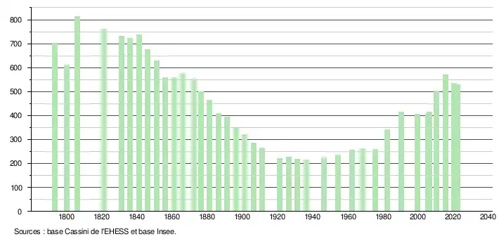 L'évolution du nombre d'habitants est connue à travers les recensements de la population effectués dans la commune depuis 1793. Pour les communes de moins de 10 000 habitants, une enquête de recensement portant sur toute la population est réalisée tous les cinq ans, les populations de référence des années intermédiaires étant quant à elles estimées par interpolation ou extrapolation[21]. Pour la commune, le premier recensement exhaustif entrant dans le cadre du nouveau dispositif a été réalisé en 2005[22].