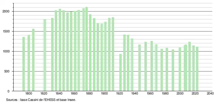 L'évolution du nombre d'habitants est connue à travers les recensements de la population effectués dans la commune depuis 1793. Pour les communes de moins de 10 000 habitants, une enquête de recensement portant sur toute la population est réalisée tous les cinq ans, les populations de référence des années intermédiaires étant quant à elles estimées par interpolation ou extrapolation[29]. Pour la commune, le premier recensement exhaustif entrant dans le cadre du nouveau dispositif a été réalisé en 2007[30].