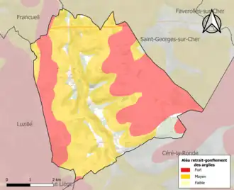Le retrait-gonflement des sols argileux est susceptible d'engendrer des dommages importants aux bâtiments en cas d’alternance de périodes de sécheresse et de pluie. 90,6 % de la superficie communale est en aléa moyen ou fort (90,2 % au niveau départemental et 48,5 % au niveau national). Sur les 259 bâtiments dénombrés sur la commune en 2019, 207 sont en aléa moyen ou fort, soit 80 %, à comparer aux 91 % au niveau départemental et 54 % au niveau national. Une cartographie de l'exposition du territoire national au retrait gonflement des sols argileux est disponible sur le site du BRGM[29],[30].