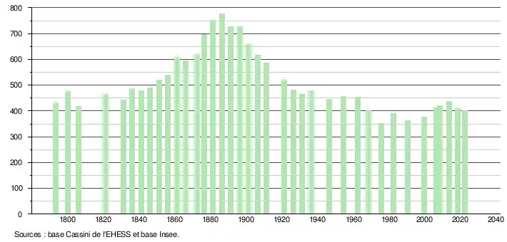 L'évolution du nombre d'habitants est connue à travers les recensements de la population effectués dans la commune depuis 1793. Pour les communes de moins de 10 000 habitants, une enquête de recensement portant sur toute la population est réalisée tous les cinq ans, les populations de référence des années intermédiaires étant quant à elles estimées par interpolation ou extrapolation[36]. Pour la commune, le premier recensement exhaustif entrant dans le cadre du nouveau dispositif a été réalisé en 2008[37].