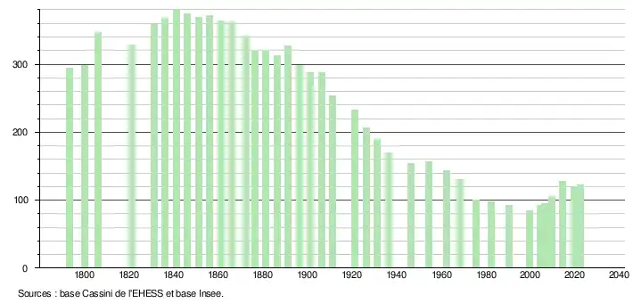 L'évolution du nombre d'habitants est connue à travers les recensements de la population effectués dans la commune depuis 1793. Pour les communes de moins de 10 000 habitants, une enquête de recensement portant sur toute la population est réalisée tous les cinq ans, les populations de référence des années intermédiaires étant quant à elles estimées par interpolation ou extrapolation[28]. Pour la commune, le premier recensement exhaustif entrant dans le cadre du nouveau dispositif a été réalisé en 2004[29].