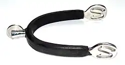 • Éperon Pessoa : éperon de toutes formes dont les branches sont recouvertes de caoutchouc et dont les passants de courroies sont en forme de "S" pour limiter le déréglage de la longueur[4]. L'illustration ci-dessous montre un éperon Pessoa muni d'une tige courte avec une grosse molette lisse. Ce type d'éperon est particulièrement adapté au saut d'obstacles et au cross pour les chevaux chauds[5] et sensibles.