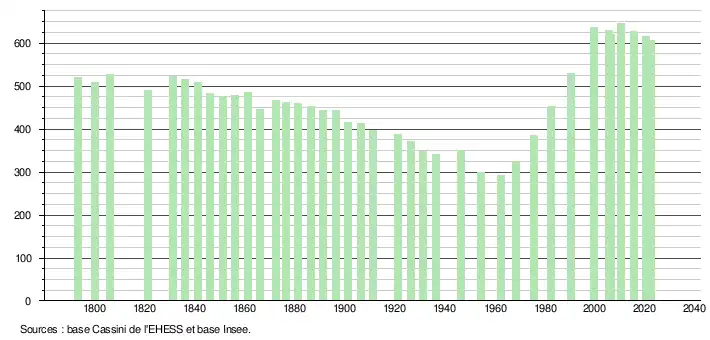 L'évolution du nombre d'habitants est connue à travers les recensements de la population effectués dans la commune depuis 1793. Pour les communes de moins de 10 000 habitants, une enquête de recensement portant sur toute la population est réalisée tous les cinq ans, les populations de référence des années intermédiaires étant quant à elles estimées par interpolation ou extrapolation[25]. Pour la commune, le premier recensement exhaustif entrant dans le cadre du nouveau dispositif a été réalisé en 2005[26].