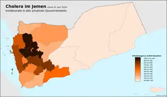 Une épidémie de choléra au Yémen commence en octobre 2016[1],[2],[3] et culmine en 2017 avec plus de 2 000 décès signalés rien que cette année-là[4],[5]. Entre 2017 et 2019, le Yémen, déchiré par la guerre, représente 84 % et 93 % des cas de choléra détectés dans le monde, les enfants constituant la majorité des cas signalés[6]. En novembre 2021, plus de 2,5 millions de cas ont été signalés et plus de 4 000 personnes décédés lors de l'épidémie de choléra au Yémen, que les Nations Unies considèrent à l'époque comme la pire crise humanitaire au monde[7],[8]. Cependant, l'épidémie diminue considérablement en 2021, avec un programme de vaccination réussi mis en œuvre et seulement 5 676 cas suspects et deux décès signalés entre le 1er janvier et le 6 mars 2021[9].