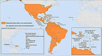 En , l'Organisation mondiale de la santé (OMS) déclare que le virus est susceptible de se propager à travers la majorité des Amériques d'ici la fin de l'année. Par la suite, en , l'OMS déclare que la microcéphalie et le syndrome de Guillain-Barré, supposés associés au déclenchement de la maladie à virus Zika, constituent une « urgence de santé publique de portée mondiale »[1].