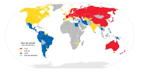 Dans le monde, 815 000 personnes se sont suicidées en 2000, soit 14,5 morts pour 100 000 habitants (un mort toutes les 40 secondes[7]). Les tentatives de suicide sont beaucoup plus fréquentes et sont estimées à 10 à 20 fois plus nombreuses que les suicides[8].
