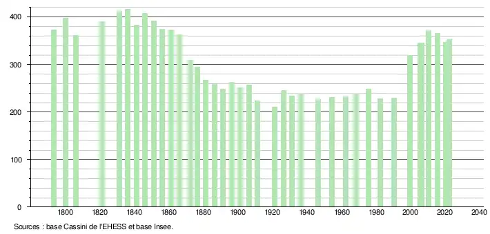 L'évolution du nombre d'habitants est connue à travers les recensements de la population effectués dans la commune depuis 1793. Pour les communes de moins de 10 000 habitants, une enquête de recensement portant sur toute la population est réalisée tous les cinq ans, les populations de référence des années intermédiaires étant quant à elles estimées par interpolation ou extrapolation[17]. Pour la commune, le premier recensement exhaustif entrant dans le cadre du nouveau dispositif a été réalisé en 2005[18].
