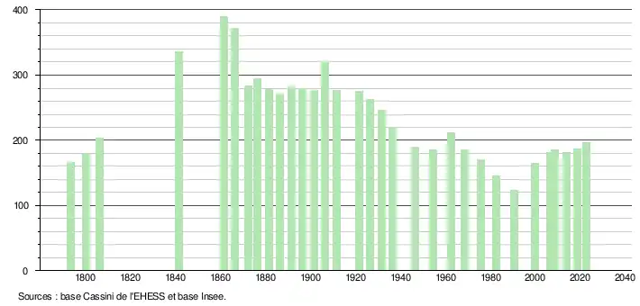 L'évolution du nombre d'habitants est connue à travers les recensements de la population effectués dans la commune depuis 1793. Pour les communes de moins de 10 000 habitants, une enquête de recensement portant sur toute la population est réalisée tous les cinq ans, les populations de référence des années intermédiaires étant quant à elles estimées par interpolation ou extrapolation[19]. Pour la commune, le premier recensement exhaustif entrant dans le cadre du nouveau dispositif a été réalisé en 2008[20].