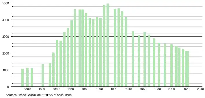 L'évolution du nombre d'habitants est connue à travers les recensements de la population effectués dans la commune depuis 1793. Pour les communes de moins de 10 000 habitants, une enquête de recensement portant sur toute la population est réalisée tous les cinq ans, les populations de référence des années intermédiaires étant quant à elles estimées par interpolation ou extrapolation[34]. Pour la commune, le premier recensement exhaustif entrant dans le cadre du nouveau dispositif a été réalisé en 2005[35].