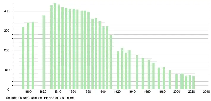 L'évolution du nombre d'habitants est connue à travers les recensements de la population effectués dans la commune depuis 1793. Pour les communes de moins de 10 000 habitants, une enquête de recensement portant sur toute la population est réalisée tous les cinq ans, les populations de référence des années intermédiaires étant quant à elles estimées par interpolation ou extrapolation[19]. Pour la commune, le premier recensement exhaustif entrant dans le cadre du nouveau dispositif a été réalisé en 2007[20].