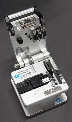 Une cliveuse permet de réaliser une coupure nette des deux fibres à souder. Certaines cliveuses sont équipées de lames en diamant
