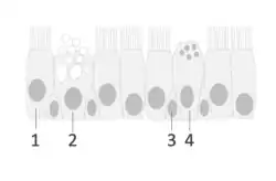 Cellules en brosse : ce sont des cellules à microvillosités apicales (mais non ciliées), que l’on trouve également dans d’autres épithéliums tels que l’intestin, l’estomac et la vessie. Elles pourraient avoir un rôle dans la réponse immune Th2[Quoi ?], en particulier anti-parasitaire[6].