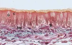 L’épithélium bronchique est un épithélium qui couvre les voies respiratoires inférieures (trachée, bronches et bronchioles). Cet épithélium est pseudostratifié et prismatique[1] de la trachée jusqu’aux bronches, puis cylindrique simple au niveau des bronchioles. Il a pour fonction la ventilation pulmonaire (conduction et contrôle des résistances), le conditionnement de l'air inspiré (humidification et réchauffement), la purification de l’air inspiré (poussières et microbes via la sécrétion de mucus et la clairance mucociliaire), et la protection contre les pathogènes potentiels (grâce à la réponse immunitaire innée de l’épithélium)[2].
