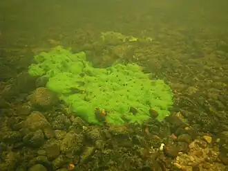 - Ephydatia fluviatilis, plus rare au nord, où elle est souvent trouvée dans des lacs eutrophes (absente des lacs dystrophes, mais aussi oligotrophes et mésotrophes en Norvège) avec macrovégétation luxuriante et à taux élevé de calcium (au moins 12,8 mg par litre avec pH élevé supérieur ou égal à 7.3); trouvée jusqu'à 341 m d'altitude en Norvège[44]. C'est une des éponges capables de se déplacer[45]