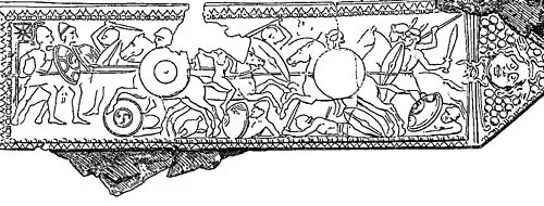 L'armée est le second pilier des royautés hellénistiques. Le roi est entouré d'un corps de troupes d'élite, tandis que des garnisons et des colonies militaires quadrillent les territoires contrôlés par les rois, qui les confient à leurs représentants provinciaux[91]. L'éducation des princes et de l'aristocratie comprend notamment une formation militaire avec des cours d'équitation et des chasses, voire la stratégie. L'institution monarchique repose sur la victoire militaire, et les revers mettent en péril la stabilité et l'intégrité des royaumes, justifiant notamment à plusieurs reprises des sécessions[81].