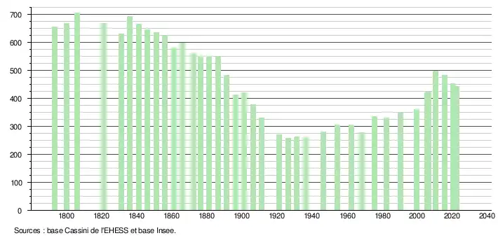 L'évolution du nombre d'habitants est connue à travers les recensements de la population effectués dans la commune depuis 1793. Pour les communes de moins de 10 000 habitants, une enquête de recensement portant sur toute la population est réalisée tous les cinq ans, les populations de référence des années intermédiaires étant quant à elles estimées par interpolation ou extrapolation[29]. Pour la commune, le premier recensement exhaustif entrant dans le cadre du nouveau dispositif a été réalisé en 2005[30].