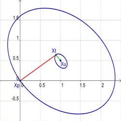 Il existe au moins deux méthodes pour décrire une figure géométrique à l'aide d'équations. La première consiste à la décrire par une équation de la forme , où est une fonction de l'espace euclidien de dimension dans où est un entier plus petit que . Si est une fonction suffisamment régulière, est la dimension de la figure géométrique. Si elle est égale à , la figure est une courbe, pour , on parle de surface, etc[27]. Une telle équation peut aussi s'écrire comme système de d équations à valeurs dans les réels exactement comme pour le cas de l'équation linéaire. Ce type d'équation est appelé cartésien si est exprimé à l'aide de ses coordonnées dans un repère cartésien[28]. Les équations décrites dans le paragraphe précédent sont toutes cartésiennes, comme celle du cercle d'équation .