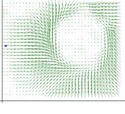 L'exemple de droite illustre une solution d'une équation de la forme , où la solution recherchée est une fonction définissant une courbe du plan. Sa variable est réelle et elle est à valeurs dans . La fonction est une fonction continue de dans lui-même. À chaque point du plan, elle associe un vecteur ; on dit qu'elle définit un champ vectoriel. Une solution possède la propriété d'avoir, pour chaque point de son image, une tangente à sa courbe de direction . La vitesse scalaire à l'instant t[Note 19] est égale à la norme de l'image par du point .