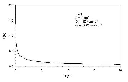 Dans le cas d'une réaction d'oxydo-réduction du type R → O + ne−, où R est le réducteur et O l'oxydant d'un couple rédox, l'équation de Cottrell s'écrit :