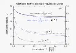 L'équation de Davies est une extension empirique de l'Équation de Debye–Hückel qui peut être utilisée pour calculer le coefficient d'activité d'une solution électrolyte de concentration relativement élevée.