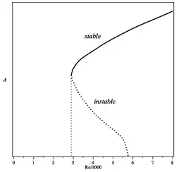 Toutefois l'absence d'instabilité linéaire ne garantit pas la stabilité pour une perturbation d'amplitude finie[8],[9]. Par exemple un écoulement de Poiseuille est instable à partir de Re = 2900 pour une amplitude donnée (voir courbe).