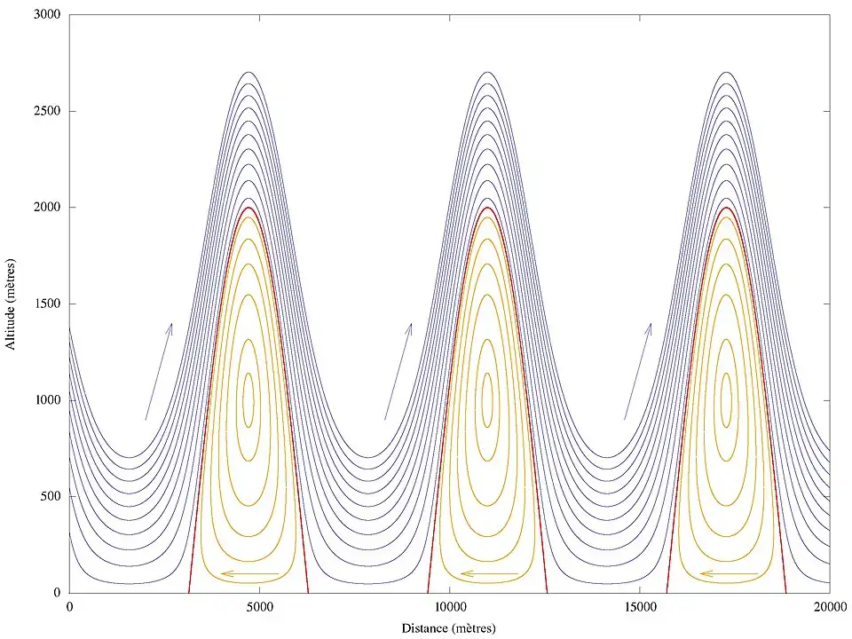 Dans le cas d'une montagne aplatie où le déplacement des lignes de courant s'expriment comme suit :