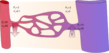 La vitesse à laquelle le liquide est filtré à travers l'endothélium vasculaire (filtration transendothéliale) est déterminée par la somme de deux actions extérieures : la pression capillaire () et la pression osmotique des protéines interstitielles (), et deux forces d'absorption; la pression osmotique des protéines plasmatiques () et la pression interstitielle (). L'équation de Starling décrit comment cet équilibre de pression régit la vitesse du fluide à travers l'endothélium. C'est l'une des équations de Kedem-Katchalski qui apporte la thermodynamique non stationnaire à la théorie de la pression osmotique à travers les membranes qui sont au moins partiellement perméables au soluté responsable de la différence de pression osmotique[7],[8]. La deuxième équation de Kedem-Katchalsky explique le transport trans endothélial des solutés, .