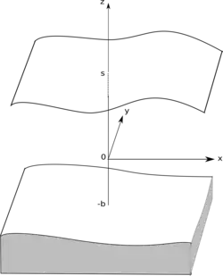 On désigne par s(x,y) l'altitude de la surface par rapport au géoïde, par b(x,y) la surface solide, par H = s - b la hauteur de fluide et g la pesanteur comptée négativement vers le bas.