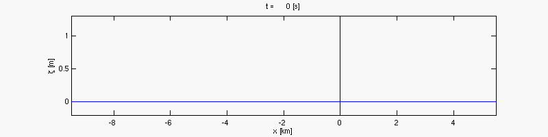 Génération et propagation d'une onde comme celle d'un tsunami. La courbe en bleu pour un milieu profond conduit à la formation d'un soliton. La courbe rouge est une onde non dispersive qui forme un front raide pouvant se décomposer en un paquet d'ondes de plus faibles longueurs d'onde. Pour celle-ci la profondeur d'eau dans le calcul est de 100 m.