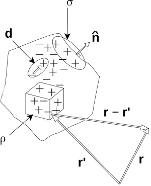 où r' est un point dans la distribution de charge, r est un point dans l'espace, et