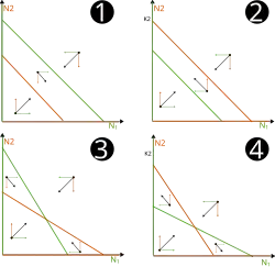 Le signe du taux de croissance effectif de l'espèce change de part et d'autre de l'isocline (positif en dessous, négatif au-dessus) ainsi la population d'une espèce non éteinte tend vers son isocline non triviale[3]. On remarque tout de suite que si l'une des deux espèces est éteinte () on se retrouve exactement dans le cas du modèle de croissance logistique. C'est aussi le cas si l'autre espèce à un niveau de population fixe ( constante) mais la capacité biotique est alors .