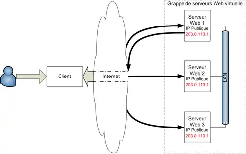 - les grappes de serveurs Web virtuelle, où une seule adresse IP est visible par le client mais sans élément central
