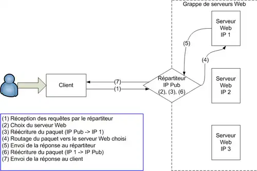 Par contre, la réponse directe du serveur au client nécessite des modifications au niveau du système d'exploitation du serveur et du répartiteur. De plus, la gestion des requêtes et des réponses permet de bénéficier de fonctionnalités de Cache web prises en charge directement par le répartiteur[43].