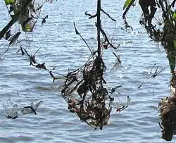 Chez les araignées, certaines espèces tissent des toiles qui piègent leurs proies (ici des mouches de mai, à la suite d'une émergence dans la nuit).