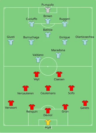 En huitième de finale, la Belgique est opposée à l'un des favoris de la compétition, l'URSS. Les Soviétiques prennent deux fois l'avance mais les Belges parviennent à chaque fois à égaliser, et prennent ensuite deux buts d'avance durant les prolongations, le dernier but des Russes ne changeant rien au résultat final (3-4)[53]. En quart de finale, la Belgique affronte l'Espagne et ouvre le score en première mi-temps. Les Espagnols égalisent à cinq minutes du terme (1-1) puis les Belges s'imposent aux tirs au but (5-4)[54]. L'aventure des Diables Rouges s'arrête en demi-finale face à l'Argentine de Diego Maradona, auteur des deux buts du match (0-2)[55]. Dans la petite finale, les joueurs belges sont à nouveau battus, après prolongations, par la France (4-2)[56],[57]. Cette quatrième place finale fut longtemps le meilleur résultat de l'équipe nationale belge en Coupe du monde[52], jusqu'à leur troisième place en 2018. Le meneur de jeu Enzo Scifo est nommé meilleur jeune joueur du tournoi par la FIFA[58], il disputera quatre Coupe du monde consécutives tout comme Franky Van der Elst (tous deux en 1986, 1990, 1994 et 1998) et Marc Wilmots (en 1990, 1994, 1998 et 2002).
