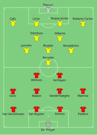 La Belgique commence le tournoi par un match nul encourageant contre le Japon (2-2)[77], un des deux pays organisateurs de la compétition, suivi d'un autre plus inquiétant contre la Tunisie (1-1)[78]. Elle remporte néanmoins le match décisif contre la Russie (3-2)[79] et se qualifie pour les huitièmes de finale. Opposée au Brésil, favori de la compétition et futur vainqueur, la Belgique fait jeu égal avec son adversaire. Marc Wilmots pense inscrire le premier but du match mais celui-ci est injustement annulé par l'arbitre Peter Prendergast. Les Belges s'inclinent en fin de match (2-0) et sont éliminés[80],[81],[82]. Wilmots est cité par la FIFA dans l'équipe-type du tournoi.