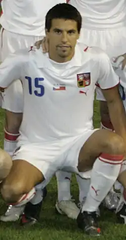 Lors de l'Euro 2008, la Tchéquie fait partie du groupe A avec la Suisse, nation hôte, le Portugal finaliste de la dernière édition et la Turquie, les Tchèques débutent idéalement leur parcours, grâce Václav Svěrkoš, ils s'imposent (1-0) lors du match d'ouverture disputé contre la Suisse[46],[47]. Lors de la seconde journée, la Tchéquie affronte le Portugal au Stade de Genève, menés rapidement par l'ouverture du score du Portugais Deco, les Tchèques égalisent rapidement par l'intermédiaire de Libor Sionko, néanmoins les Portugais inscrivent deux nouveaux buts par Cristiano Ronaldo à l'heure de jeu puis Ricardo Quaresma dans les arrêts de jeu pour une défaite (3-1) des Tchèques[48]. Le dernier match disputé contre la Turquie est décisif pour la qualification en quart de finale, les Tchèques ouvrent le score par Jan Koller avant que Jaroslav Plašil ne donne deux buts d'avance aux Tchèques, encore qualifiés à un quart d'heure du terme de la partie, Arda Turan puis Nihat Kahveci permettent à la Turquie d'égaliser emmenant les deux sélections à la séance de tirs au but avant que Nihat Kahveci n'inscrive un doublé éliminant avec ce (3-2) la Tchéquie[49],[50].