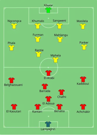À la 9e minute, sur un corner d'Abdelaziz Barrada, Issam El Adoua a ouvert le score par un but de la tête. Après avoir dominé la première période, les Lions de l'Atlas se sont éteints au retour des vestiaires, dans la seconde période, les Marocains ont raté plusieurs occasions, notamment celles de Chafni (20e, 45e), Barrada (48e) ou encore El-Arabi (60e). May Mahlangu en a profité pour égalise sur un magnifique tir à la 70e minute, ensuite vers la fin de la rencontre, le jeune rajaoui Abdelilah Hafidi mène pour la deuxième fois les marocains au score (82e min), quatre minute après, sur un tir à l'entrée de la surface Siyabonga Sangweni égalise le score pour les Bafana Bafana. Les Marocains sont éliminés de la CAN sans perdre le moindre match [13],[14]!