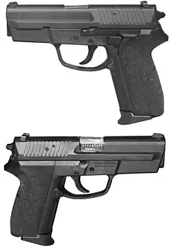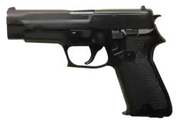 9 × 19 mm Parabellum | Entrée en service en 1975. Pistolet automatique Simple action/Double action sans sécurité manuelle alimenté par un magasin simple colonne de 9 cartouches[2] en cours de remplacement par le Glock 17[1]. 160 000 construits pour l'armée et les forces de l’ordre suisses. |