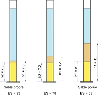 L’essai consiste à verser un échantillon de sable et une petite quantité de solution floculante dans une éprouvette graduée et d’agiter de façon à détacher les revêtements argileux des particules de sable de l’échantillon. On complète alors le sable en utilisant le reste de solution floculante afin de faire remonter les particules fines en suspension au-dessus du sable. Après 20 min, les hauteurs des produits sont mesurées. L’équivalent de sable est le rapport hauteur du sable sur hauteur totale, exprimé en pourcentage[3].