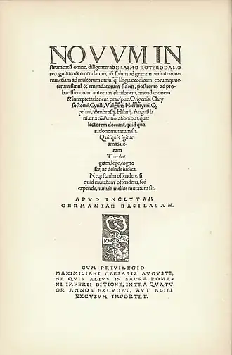 Page de titre de la première édition à Bâle du Novum Instrumentum omne (1516).