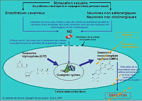 Sous contrôle de récepteurs spécifiques, les récepteurs P2y, et à l’intérieur du muscle, ce monoxyde d’azote active la guanylate cyclase, ce qui a pour conséquence d’entraîner une transformation de la guanosine triphosphate en guanosine monophosphate cyclique (GMPc). L’accumulation de GMPc mène, entre autres, à une relaxation de la musculature lisse des artères péniennes et du tissu intra-caverneux, ces dernières comprimant les petites veines et diminuant ainsi fortement le retour veineux[3], les deux[Lesquels ?] phénomènes contribuant ainsi à l’engorgement des corps caverneux du pénis et, in fine, à l’érection.