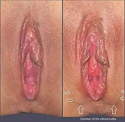 Photo de droite : Saillie du gland clitoridien, en bas les bulbes clitoridiens gonflés apparaissent sous la peau.
