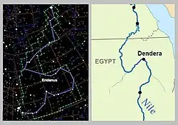 Cette constellation de l'hémisphère austral doit son nom à un fleuve de la mythologie grecque. On dit parfois qu'il s'agirait du Pô ou du Rhône mais certains Grecs, dont Diodore et Théon d'Alexandrie, assurent que le nom d’Éridan remplaça le nom du Nil, Ératosthène dit même qu'Aratus appelle Éridan le fleuve d'Orion.